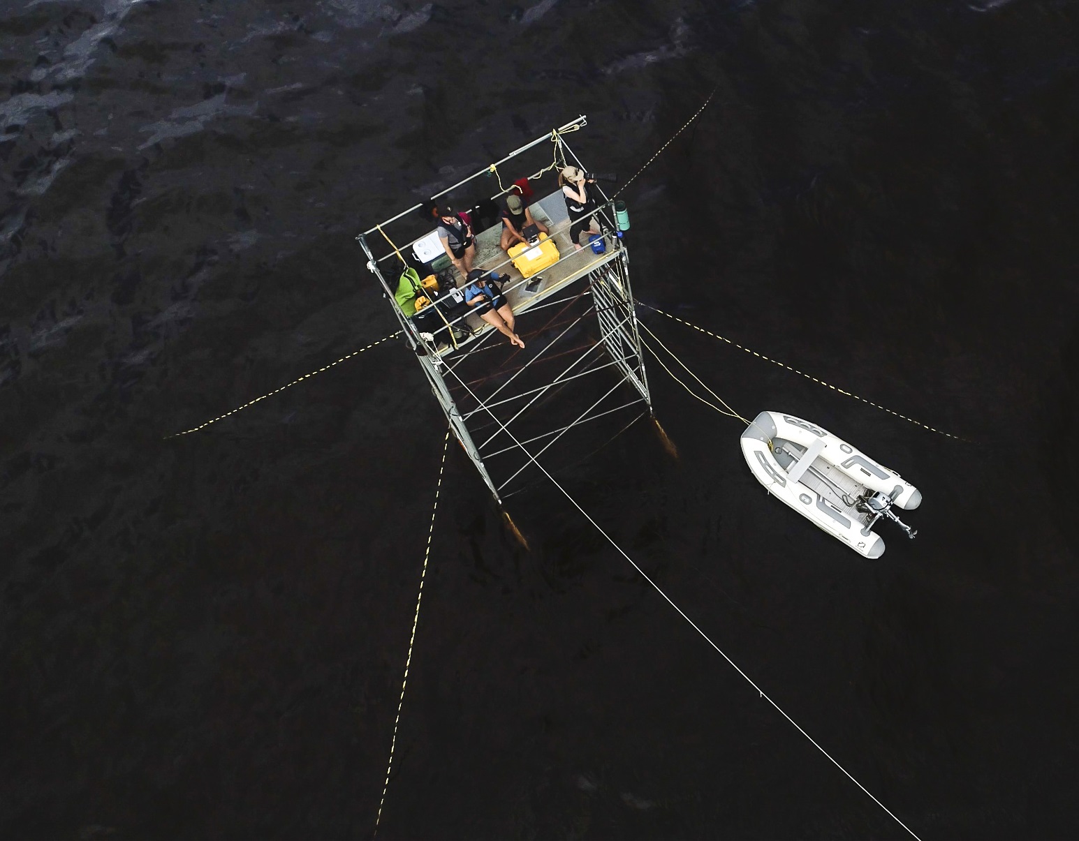 The platform on which the research team is perched allows the beluga whales of Sainte-Marguerite Bay to be monitored throughout the summer. Photo Credit: Ocean Wise & GREMM