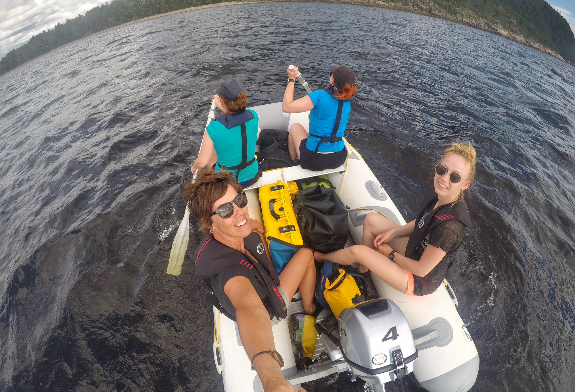 The Sainte-Marguerite Bay research team paddle silently to the tower. Foreground: Dr. Valeria Vergara and Josephine Schulze. Background: Marie-Ana Mikus and Jaclyn Aubin. Photo Credit: Valeria Vergara
