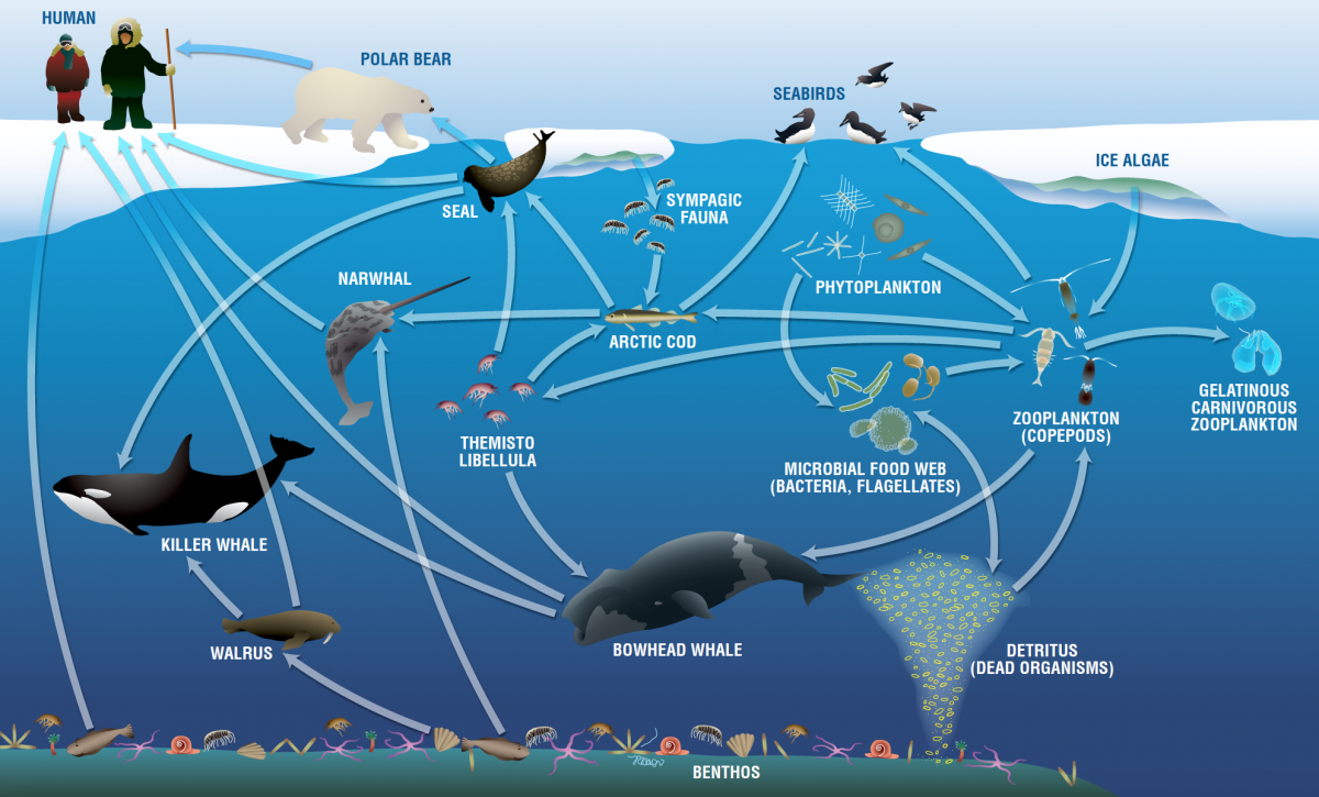 If you’ve ever heard of a food chain, I invite you now to think about a marine food web – that is, the interconnected network of food chains that makes up the ocean ecosystem (see the Arctic food web below). Because marine food webs are so inter-connected, when we interact with them through the course of fishing, it is important to also consider the needs of the ecosystem in addition to our own food needs when accounting for the total volumes we fish.