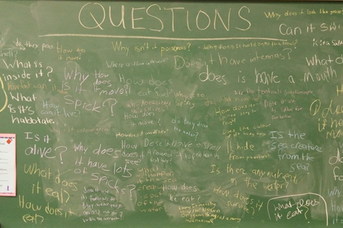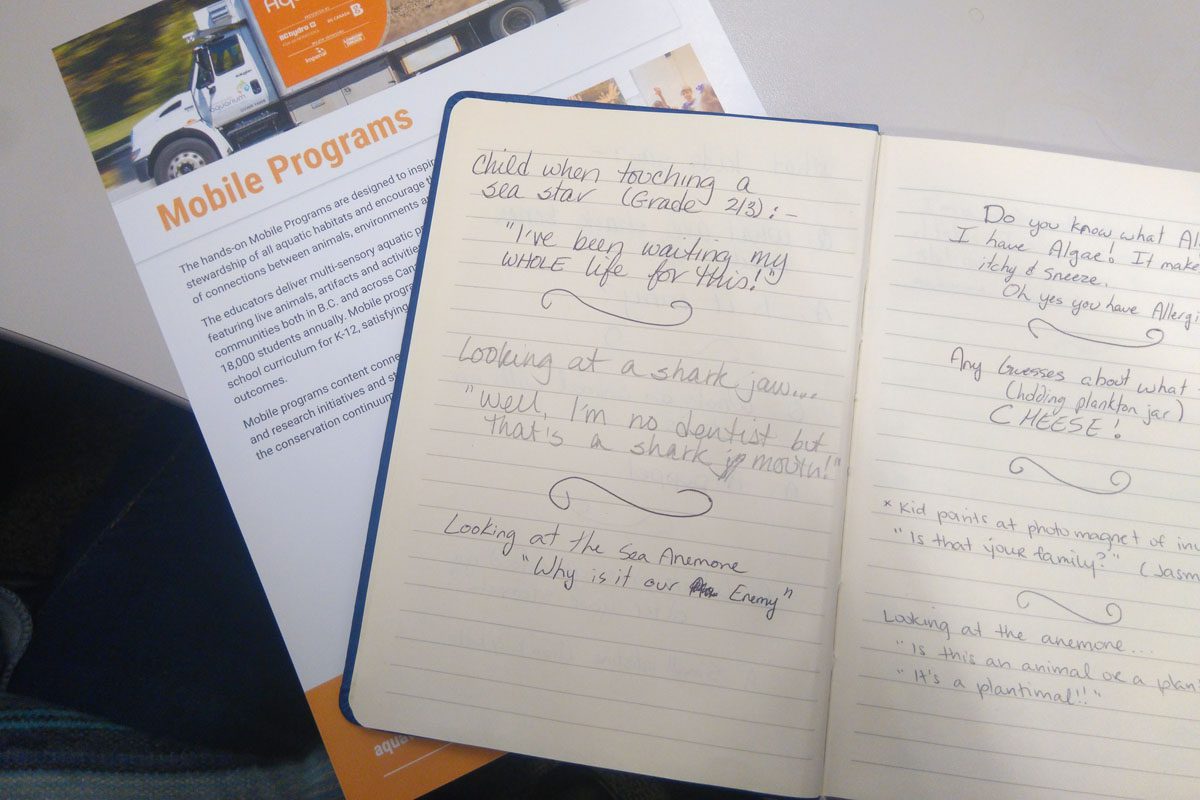 Every year, the AquaVan brings mobile aquariums into hundreds of classrooms across Canada. Understandably, the 18,000 students we speak with annually have questions about the animals they’re meeting, like urchins, sea stars, crabs, anemones, and sea cucumbers. Most questions we field are pretty straightforward and we have the answer at the ready. But sometimes they’re not, which is where AquaVan’s little blue book comes in. This book keeps track of all the cute, funny or just plain weird questions we get.