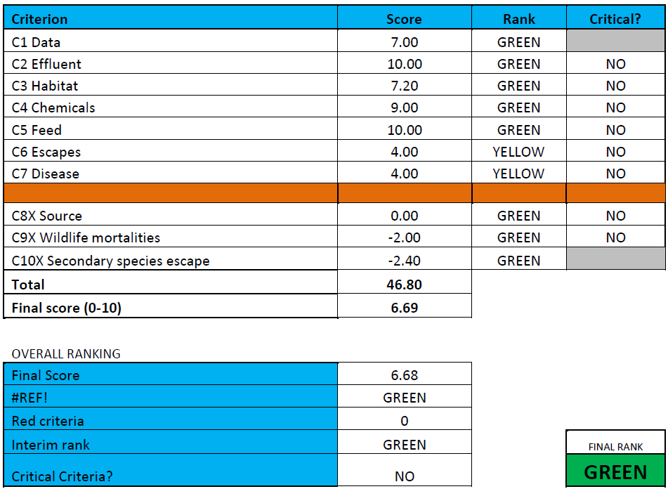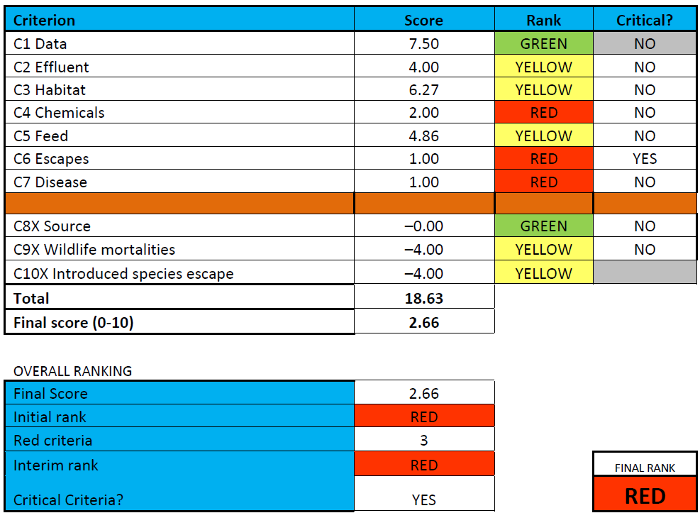 Enfin, de nombreux rapports sont incroyablement précis, couvrant une seule espèce cultivée d’une seule manière dans un lieu donné. Par exemple, ci-dessous vous trouverez le score final pour tous les saumons d’élevage en filet ouvert de Norvège :
