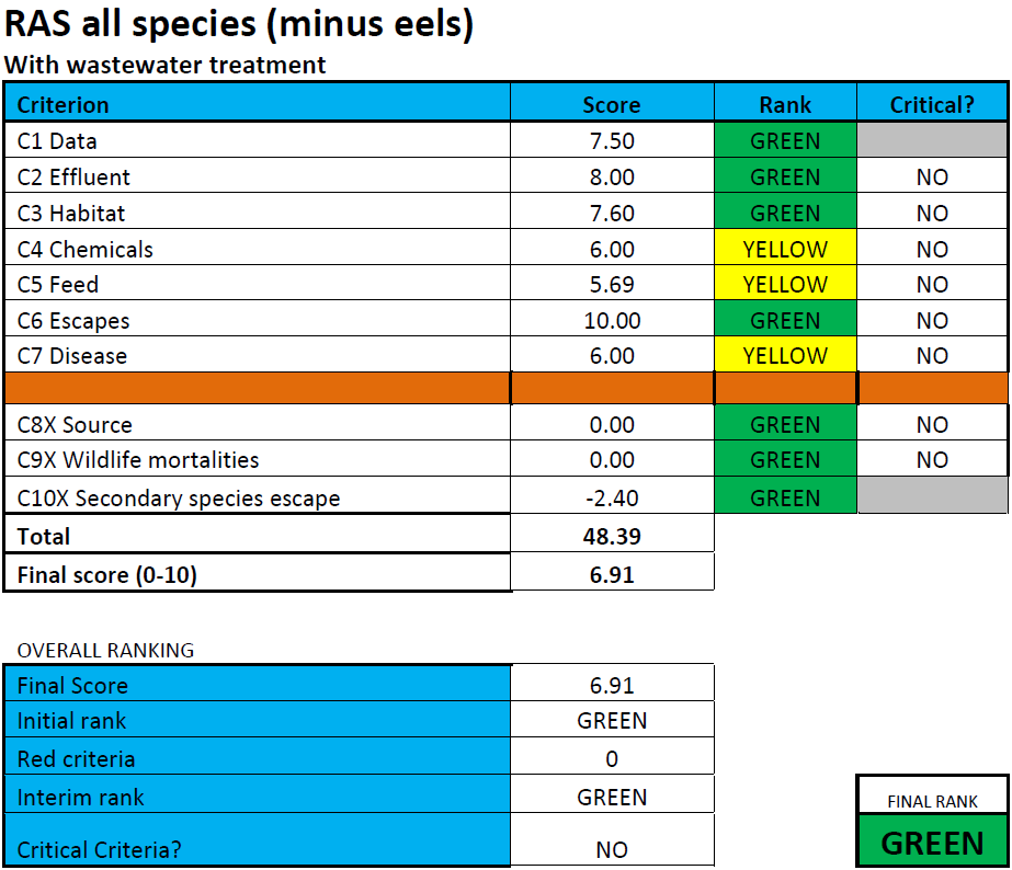 Certains rapports peuvent même être aussi larges que couvrir une seule méthode de culture des fruits de mer à l’échelle mondiale, quelle que soit l’espèce ou la localisation. L’une de ces évaluations est le rapport sur les systèmes globaux d’aquaculture à recirculation (RAS) qui contient deux recommandations, l’une pour le SAR mondial sans traitement des eaux usées (score final 6,63) et une autre pour le SAR mondial avec traitement des eaux usées :
