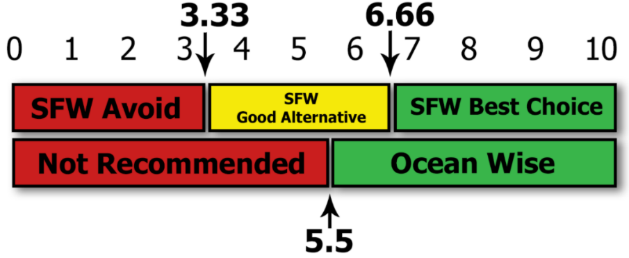 Chaque évaluation évalue les fruits de mer (ou dans certains cas, simplement le système de production comme nous l’avons vu pour le RAS) selon les 10 critères définis dans la norme SFW. Le score final selon tous les critères détermine la recommandation d’Ocean Wise – tout score supérieur à 5,5 sur 10 est recommandé par Ocean Wise sans notes critiques, tout ce qui est en dessous ou avec des scores critiques ne l’est pas.