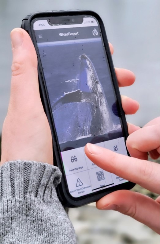Les rapports d’observation de baleines peuvent être réalisés via l’application téléchargeable WhaleReport, ou en WildWhales.org via l’application web. L’application est disponible sur